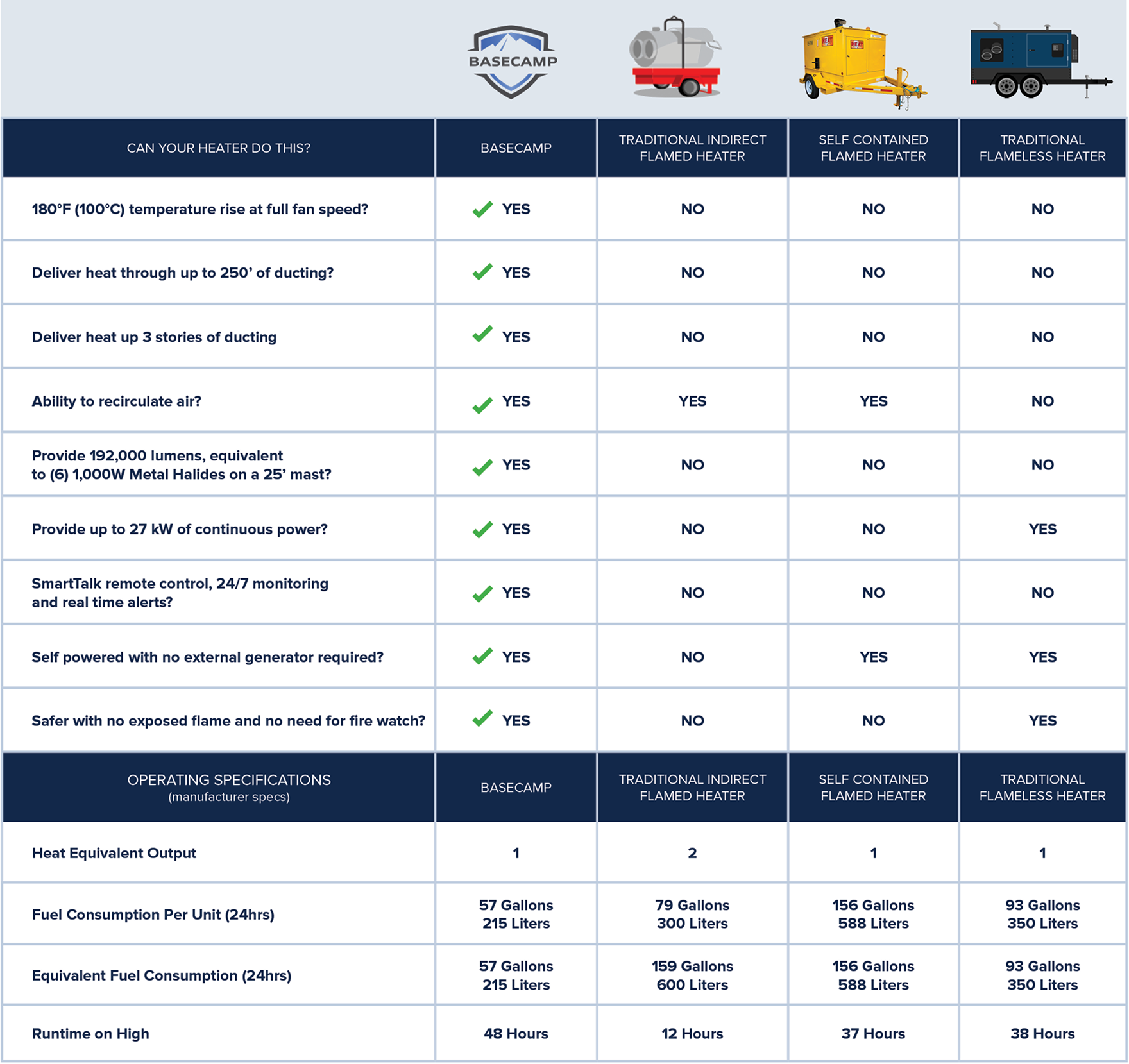 Here’s a comparison chart showcasing how BASECAMP stacks up against traditional heaters: